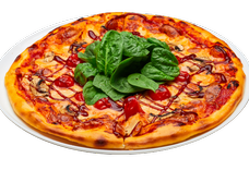 пицца-соус, моцарелла, прошутто, шампиньоны, перец, черри, маслины, шпинат