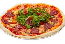 пицца-соус, моцарелла, прошутто, шампиньоны, черри, руккола