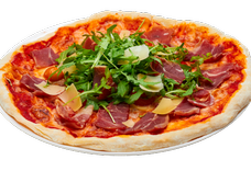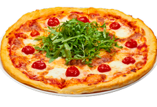 Пицца-соус, моцарелла, пармезан, прошутто, черри, маслины, руккола